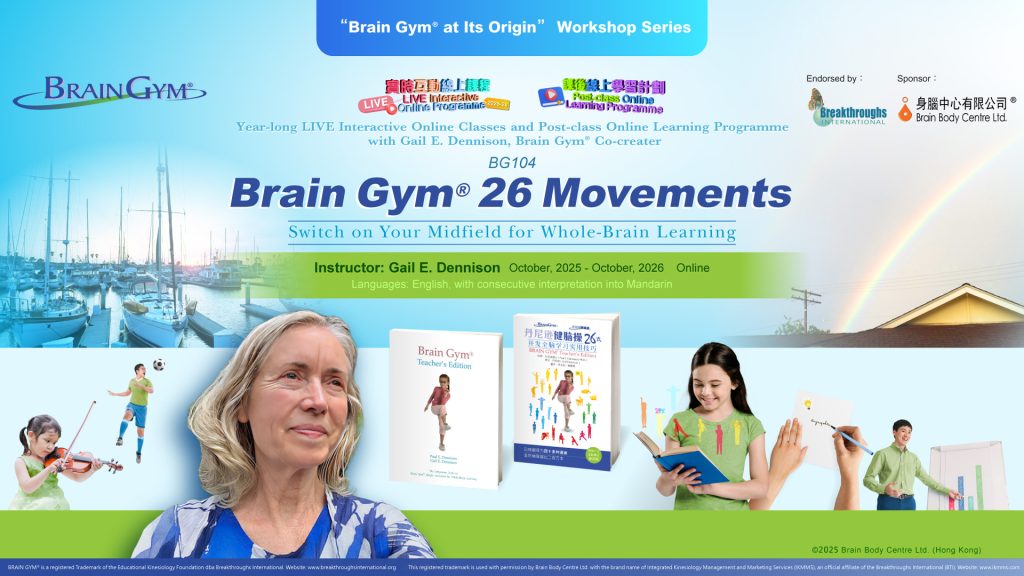 BG104 Brain Gym® 26 Movement Workshop – 26 sessions for 1 hour each, and so 26 hours in total.