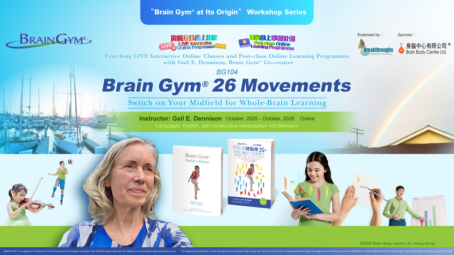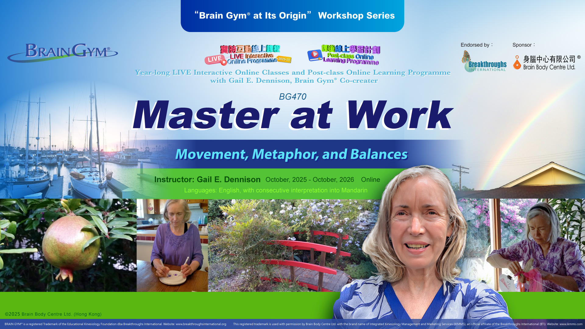 Join Gail Dennison, the co-creator of Brain Gym®, in a year-long, live online learning programme for the Brain Gym® 26 movements (BG26) through two consecutive and highly-related courses, i.e. the introductory BG104-Brain Gym 26® Movement and the more advanced BG470 Master at Work, to get balances using simple movement metaphors and Brain Gym® variations with the Master of the Craft of Edu-K.