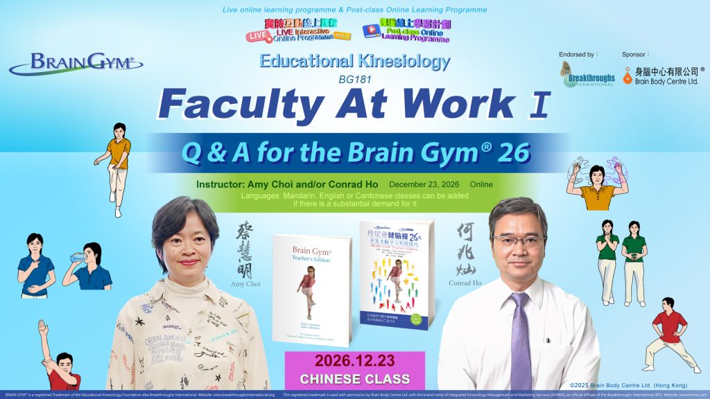 Want clarifications on your questions about the Brain Gym® 26 Activities? Ask International Faculty members Ms. Amy Choi and/or Mr. Conrad Ho. Having learnt from renowned teachers, Amy and Conrad have over 26 years’ experience teaching Brain Gym® both locally and overseas. They have translated and published almost all of Paul and Gail Dennison’s Brain Gym® books and manuals into Chinese, and are dedicated to continuously improving the quality of teaching and teaching materials in the Chinese-speaking communities worldwide. Amy and Conrad have trained over 250 Brain Gym® instructors and consultants in the China region. Amy has also over 10 years’ experience teaching Brain Gym® in Japan. They have been mentoring Brain Gym® instructors to grow into key teaching roles. They love their work and are constantly using Brain Gym® in their family, business and daily lives.