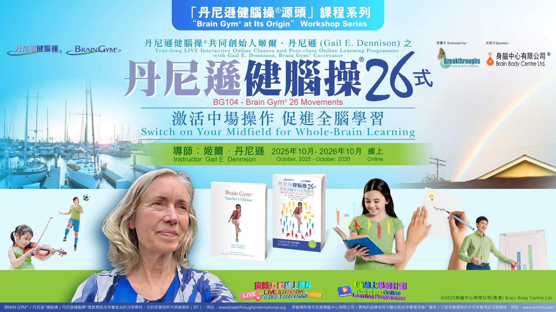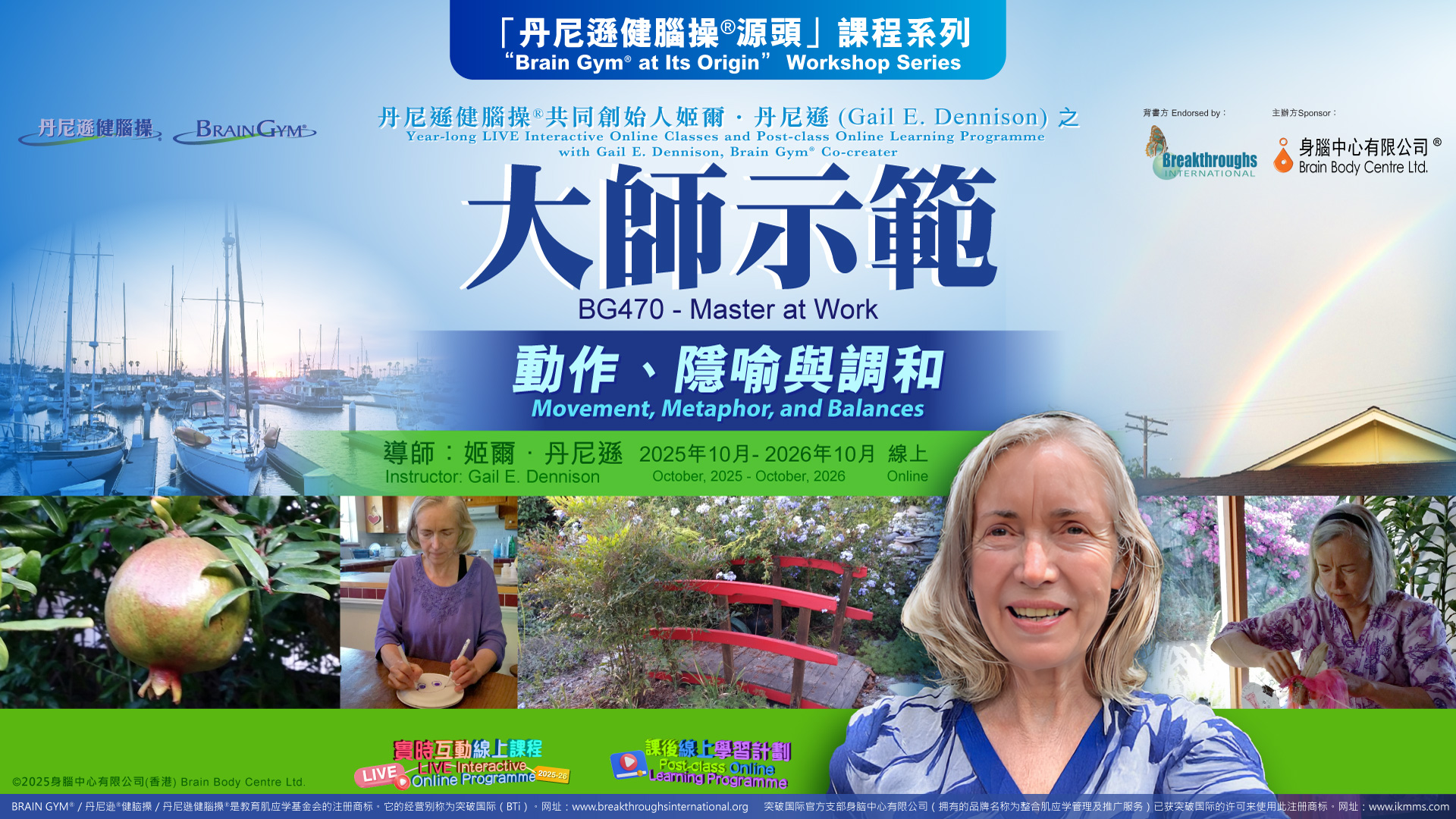 跟隨丹尼遜健腦操®(BRAIN GYM®) 的共同創始人姬爾.丹尼遜,通過一年的時間,深入並徹底地學習丹尼遜健腦操® 26 式!您會通過兩個連續而高度相關的實時互動線上課程,即入門的「BG104 – 丹尼遜健腦操® 26 式」,以及更深入的「 BG470 – 大師示範」課程,通過簡單的動作隱喻與丹尼遜健腦操®的變化動作,來做調和。